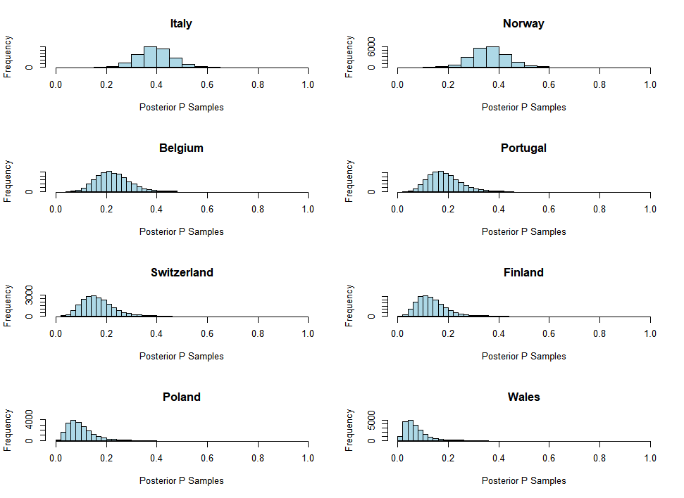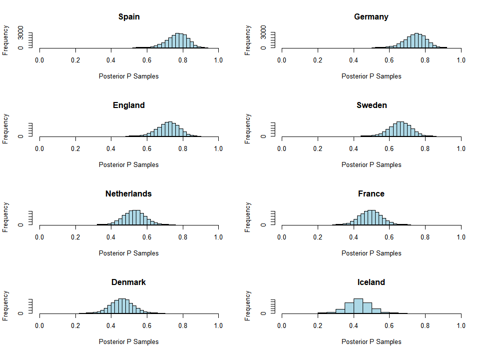 To assess the fit and evaluate the simulations from our model, the effective sample size and the R hat values for each team’s posterior samples of \(p_i\), the probability of getting past the group stage, were examined. From our model, the effective sample size and the R hat for our samples for each team suggest signs of MCMC mixing and convergence. In particular, for each posterior estimate for \(p_i\), the R hat value was below 1.000 for all the teams, and the effective sample size was also reasonable and ranged from 6,500 - 21,834, indicating a large number of independent samples.